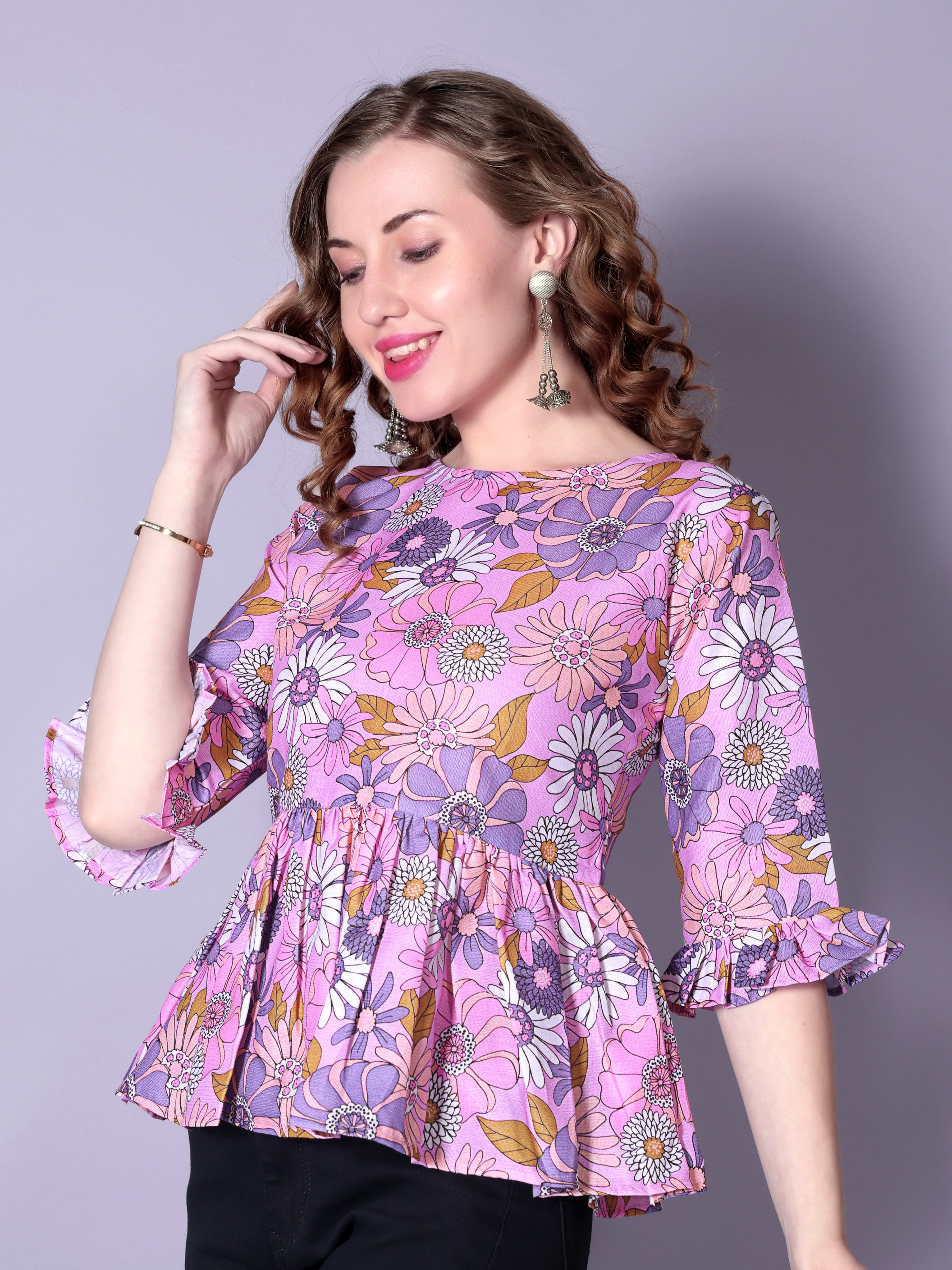 Pink Printed Bell-Sleeve Tunic for Women – Stylish Cotton 3/4 Sleeve Top | Trendy Casual & Office Wear Malaysia 2025