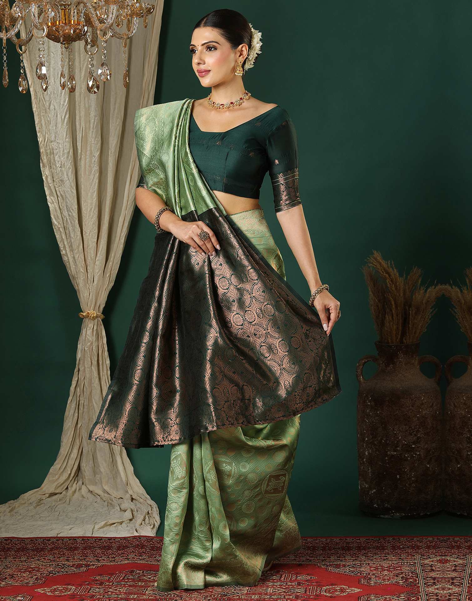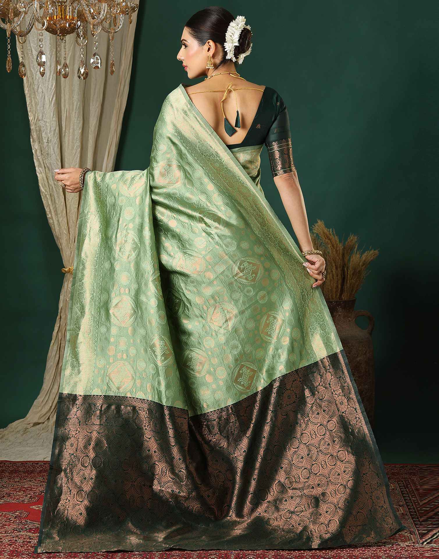 Blouse Color: Dark Green with Golden Woven Work