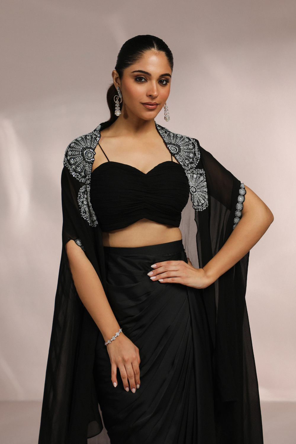 Black Dhoti Skirt with Blouse & Embroidered Cape Set