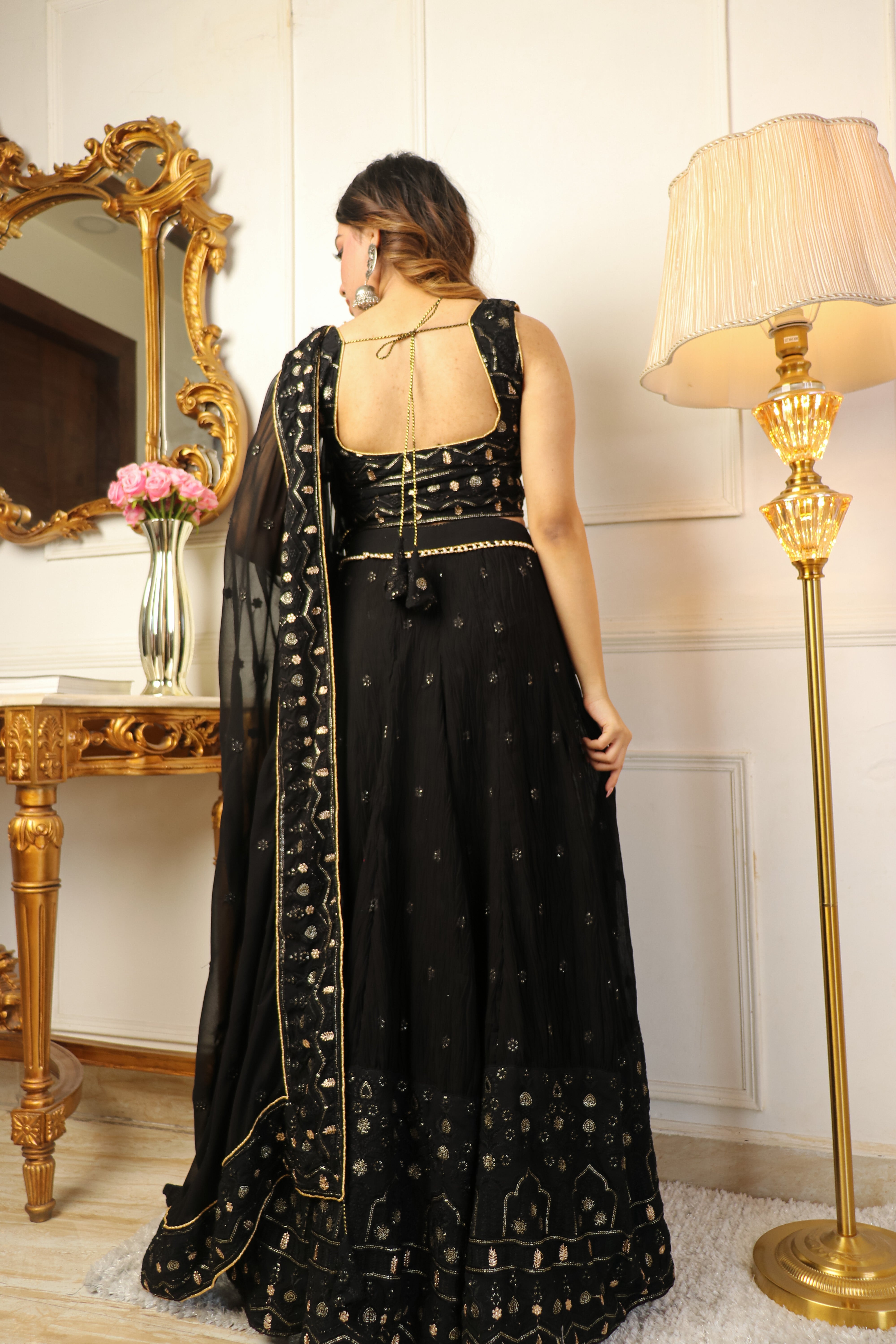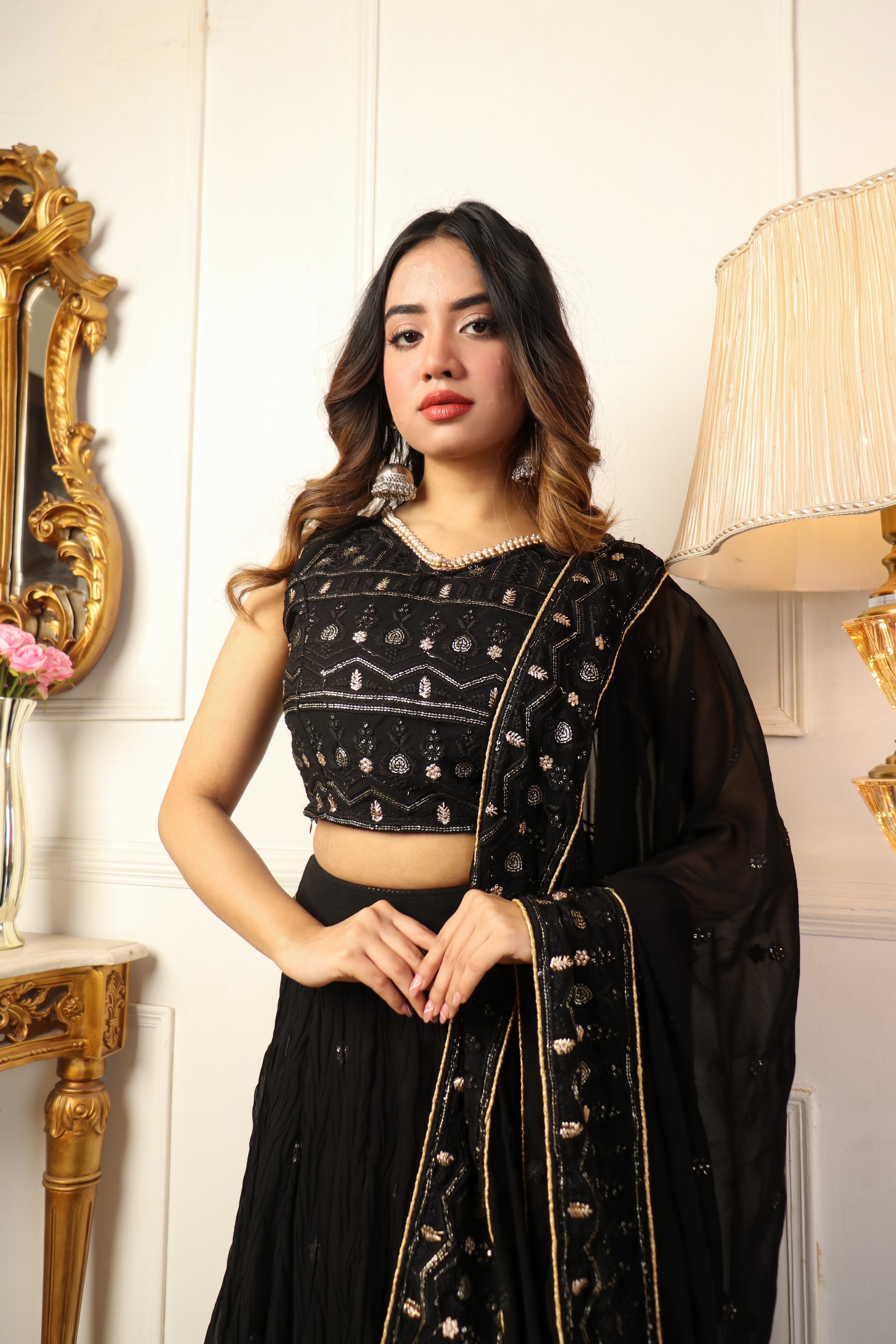 BLACK SEQUINS EMBROIDERED GEORGETTE LEHENGA CHOLI. This Kurti Is A Must Have In Every Woman's Wardrobe. |