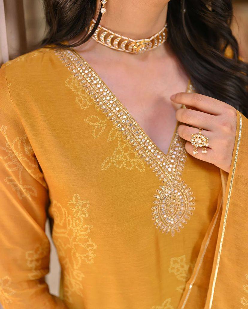 MUSTARD  COLOURED  WOMEN'S  PRINTED  EMBROIDERED   KURTA  WITH PANT DUPATTA  SET