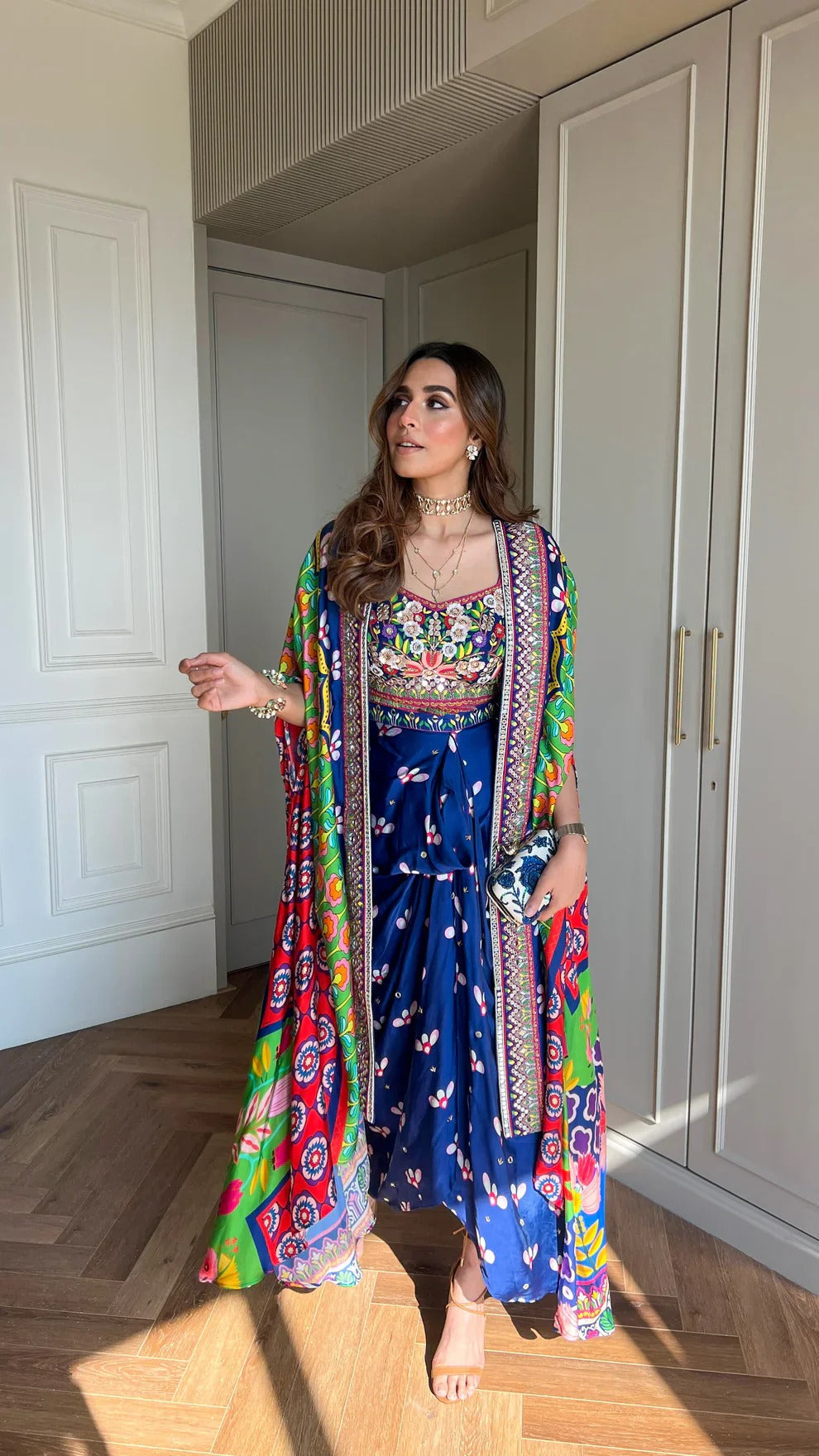 Embelished Indica Dhoti Skirt Paired With Embriodered Bralette & Cape | |