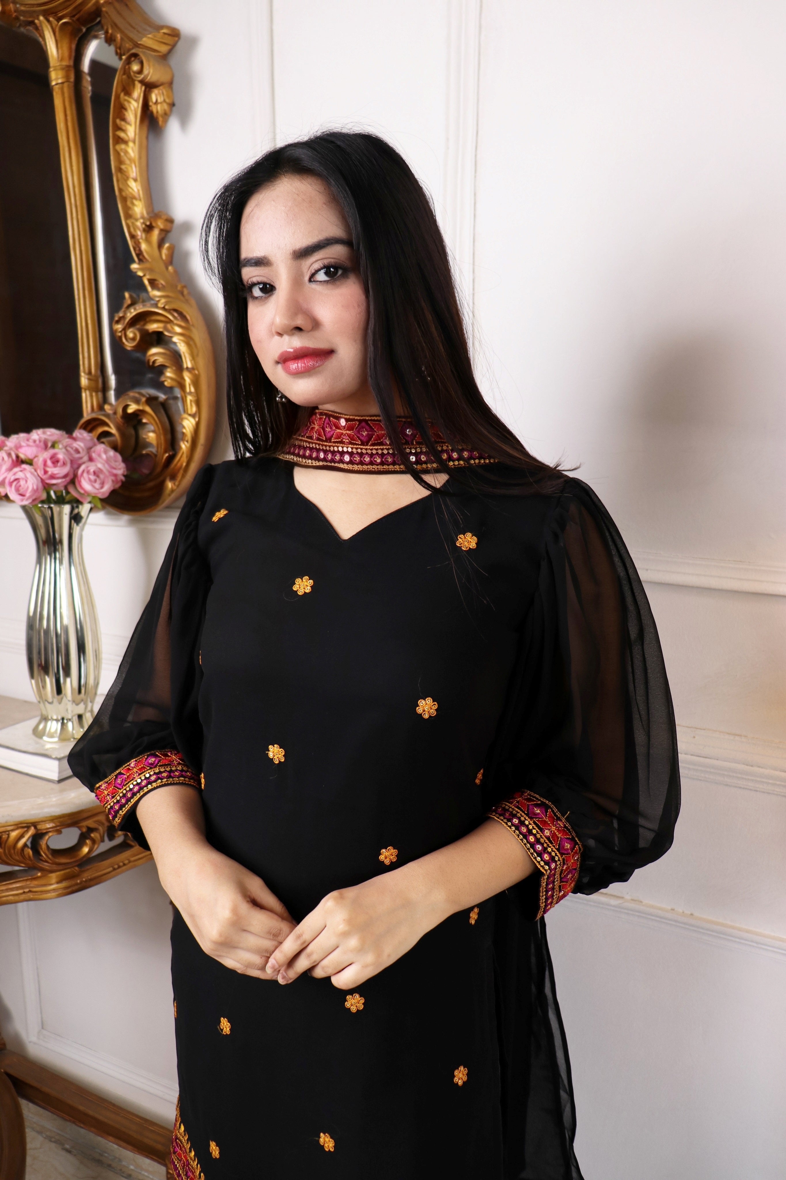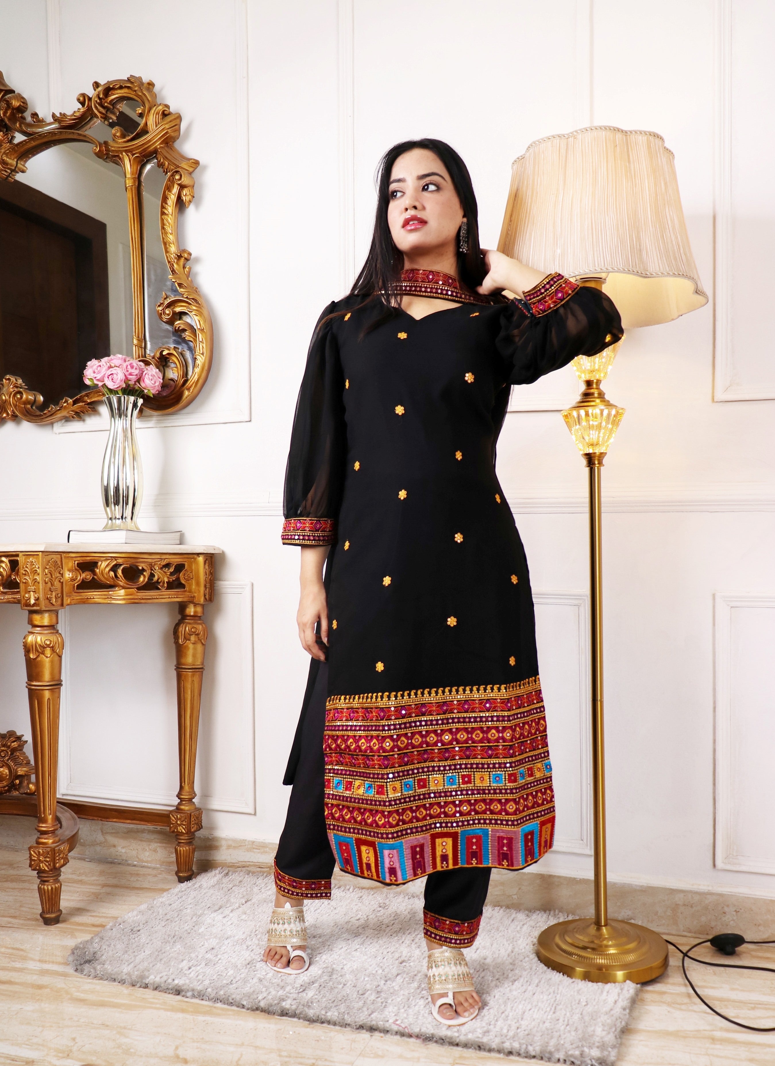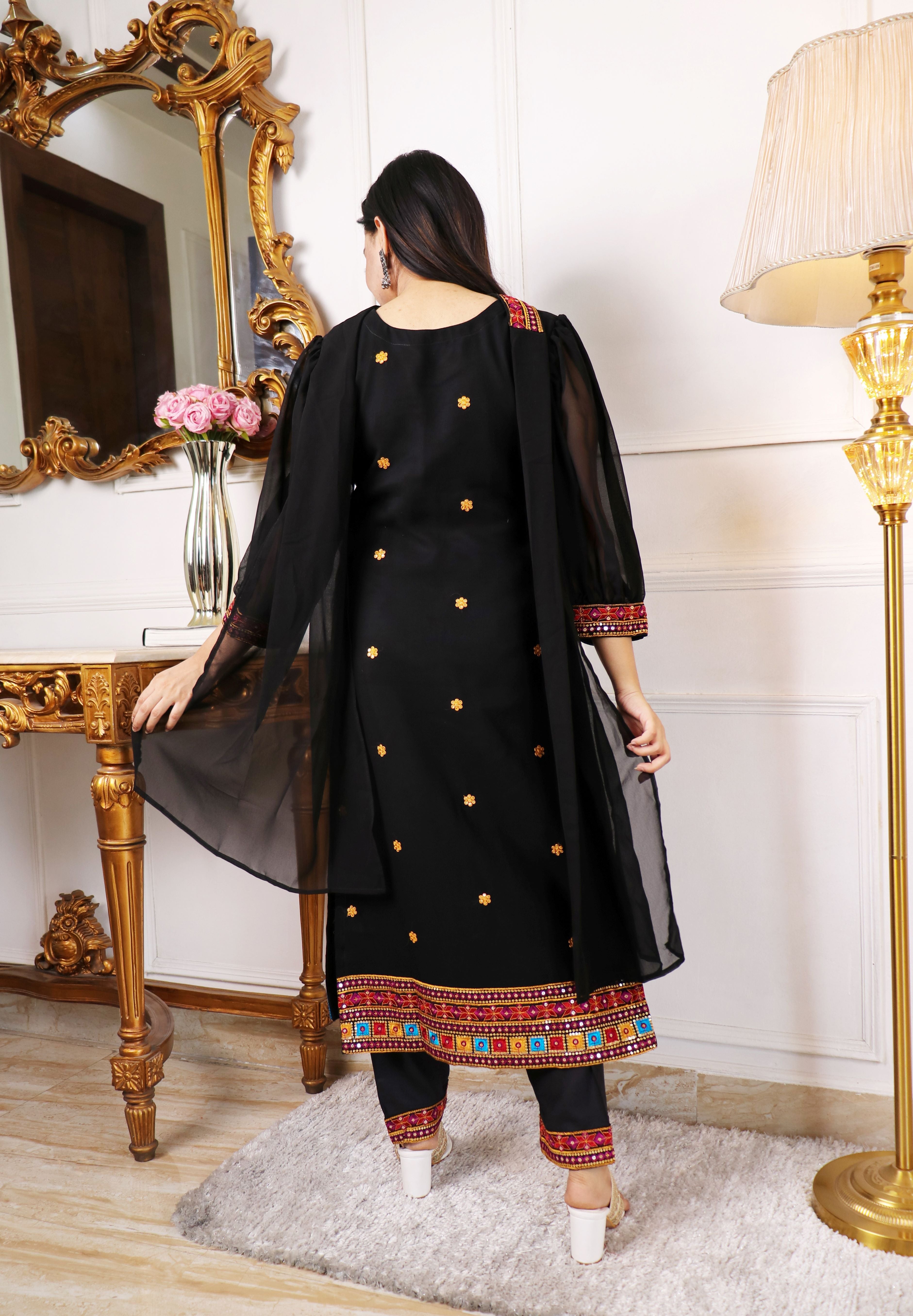 EMBELLISHED THREAD WORK KURTA WITH TROUSERS & DUPATTA SET | |