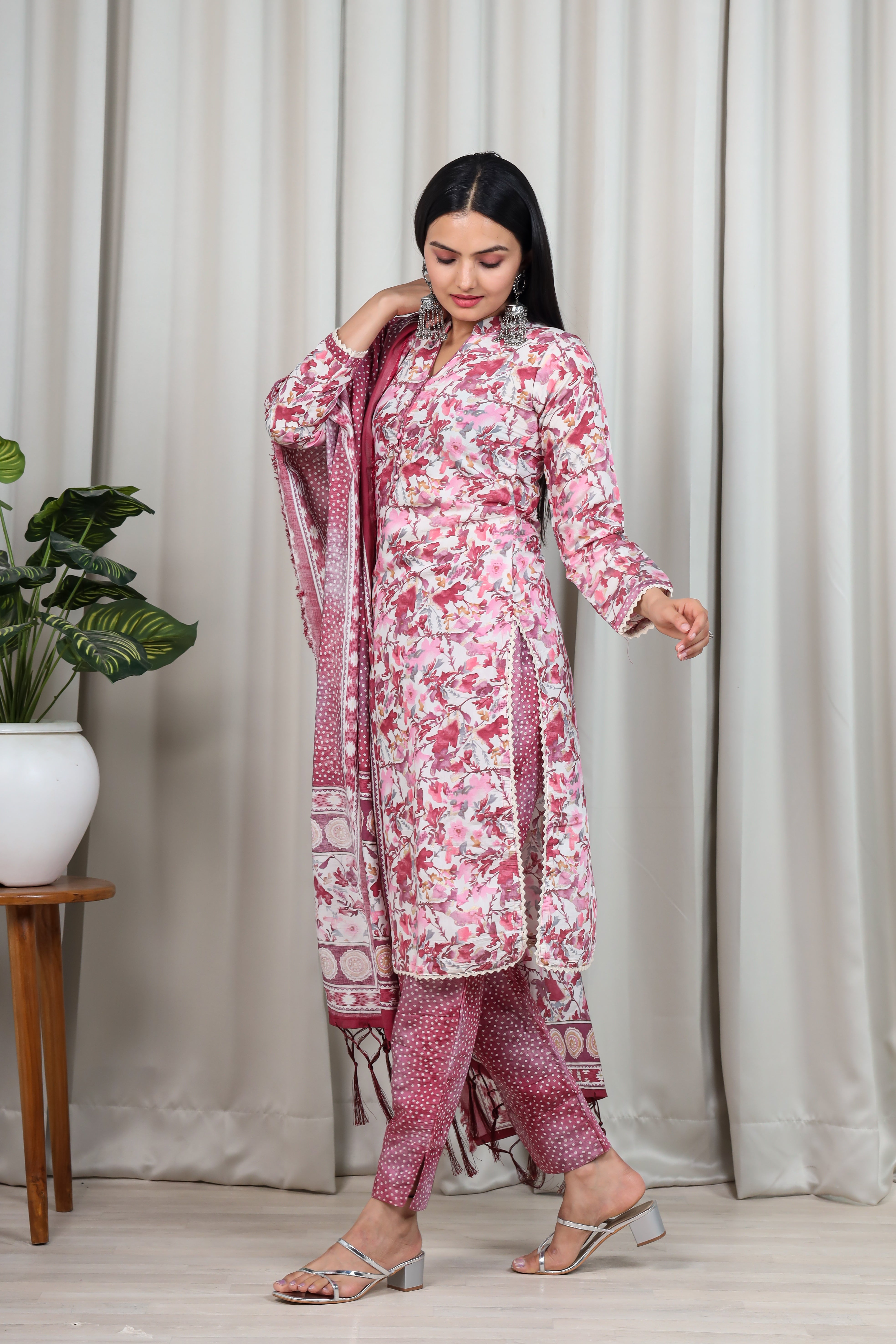 Buy FLORAL PRINTED CHANDERI COTTON KURTA WITH TROUSERS & DUPATTA This Kurti Is A Must Have In Every Woman's Wardrobe.