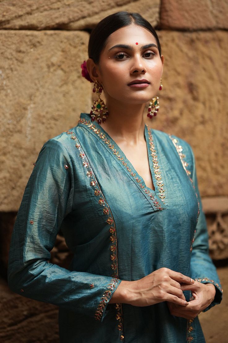 Green Kurta And Pant Tissue Embroidered Aari V Neck Set | |