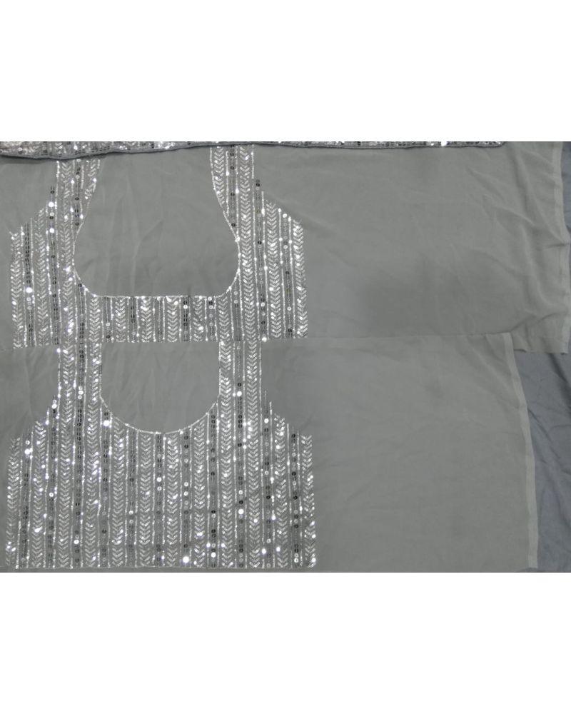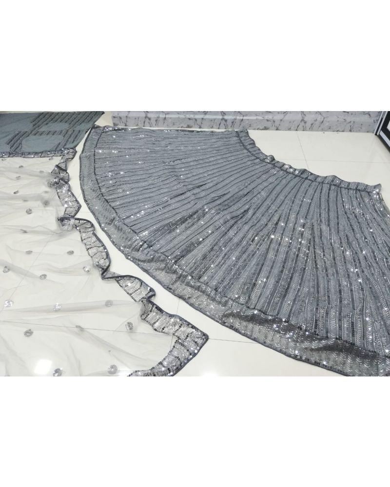 Step into the spotlight with ..OmVogue..’s stunning grey colored georgette lehenga choli adorned with elegant sequins work — a perfect blend of modern glamour and timeless tradition. This designer piece is ideal for women seeking a chic wedding lehenga, bridal designer lehenga, or a graceful lehenga for engagement.