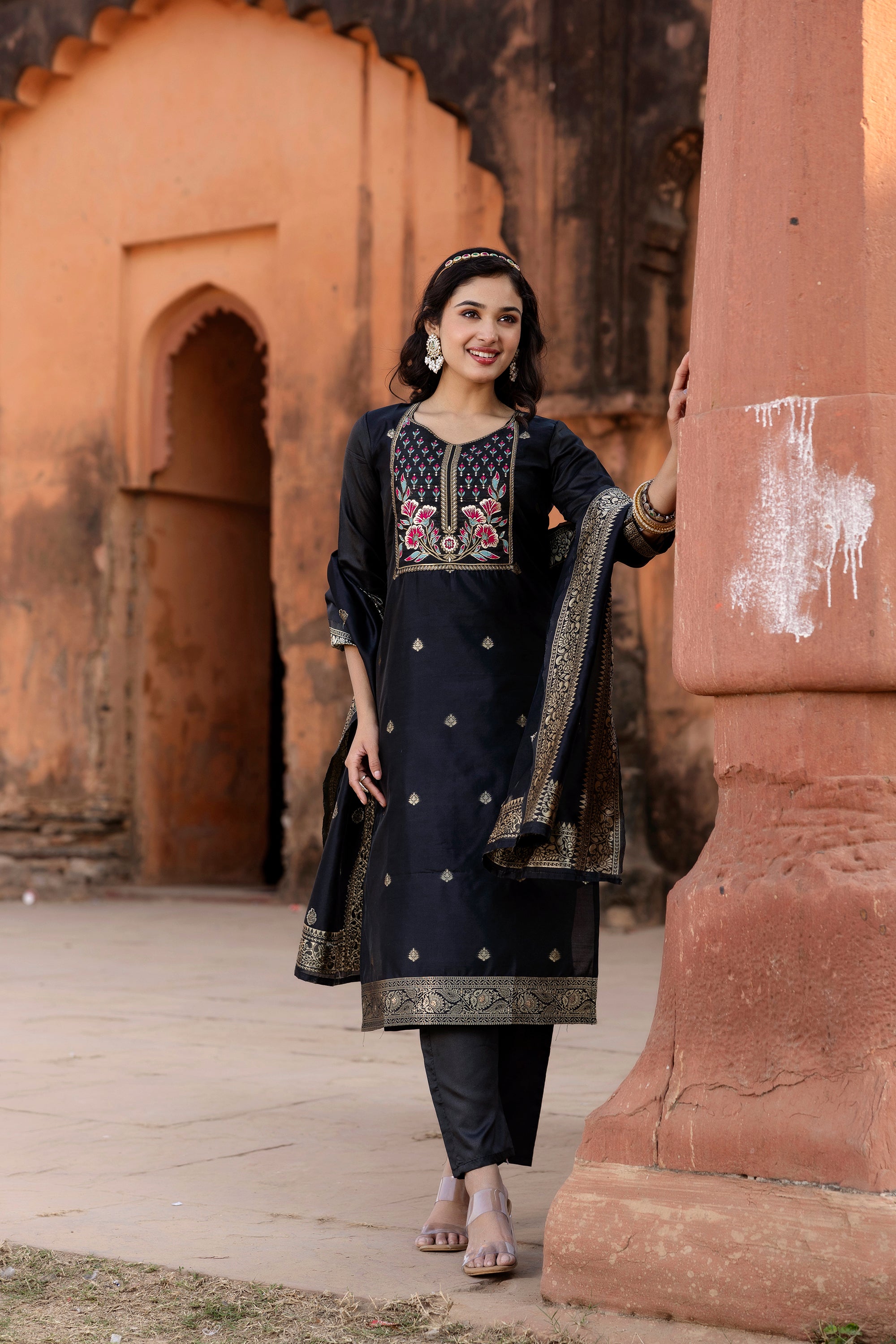 Elegant Jacquard detailing on kurta & dupatta for festive charm.