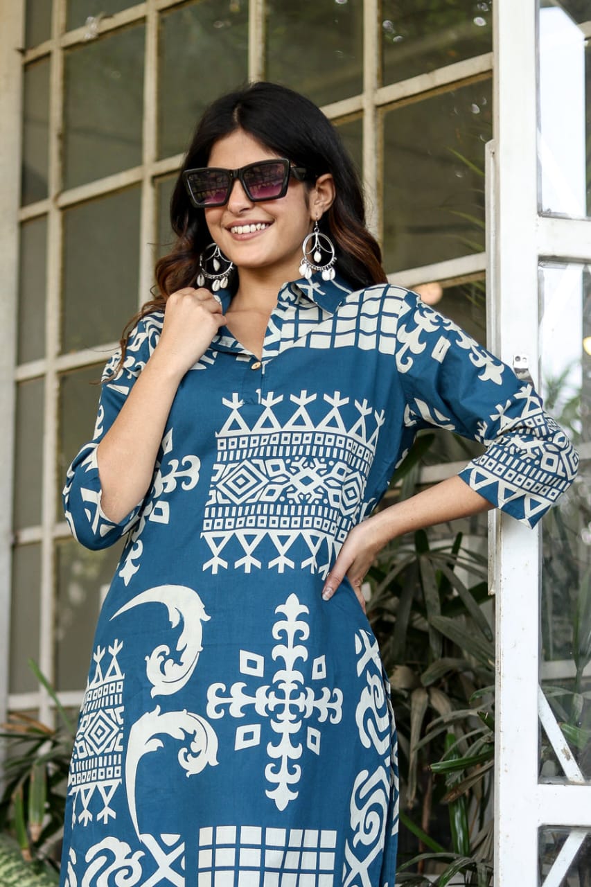 Maryam Teal Blue Cotton Kurta with Bottom | Digital Printed | Casual & Office Wear – Malaysia