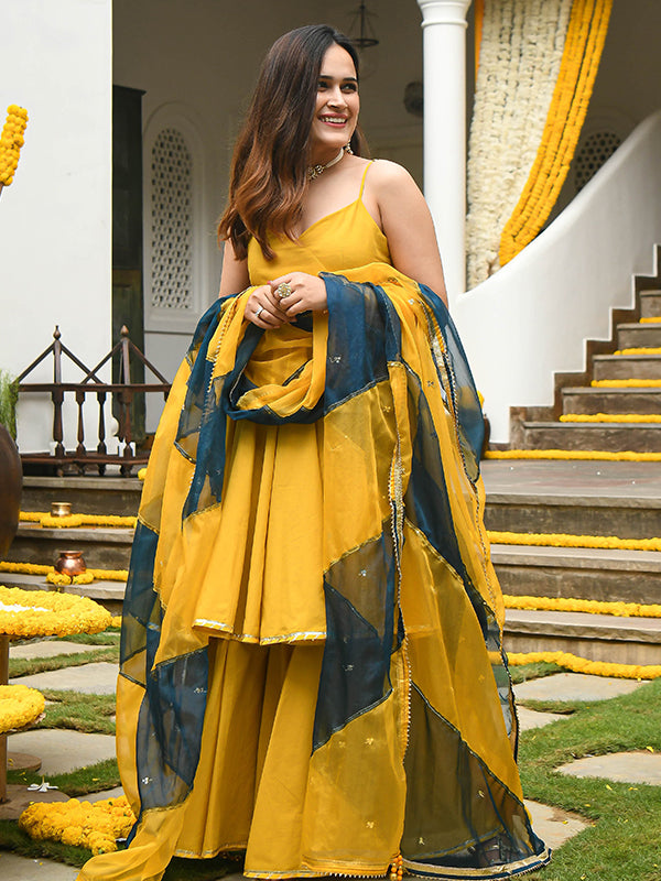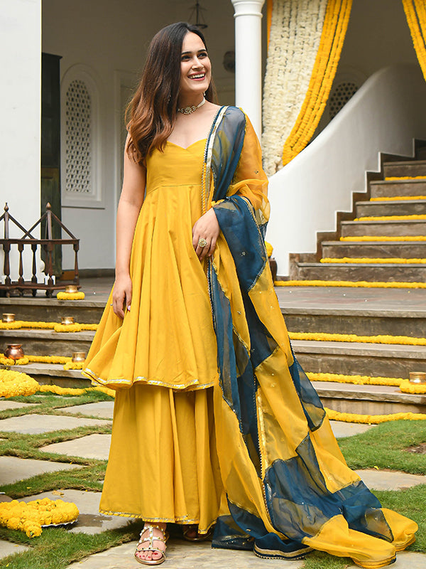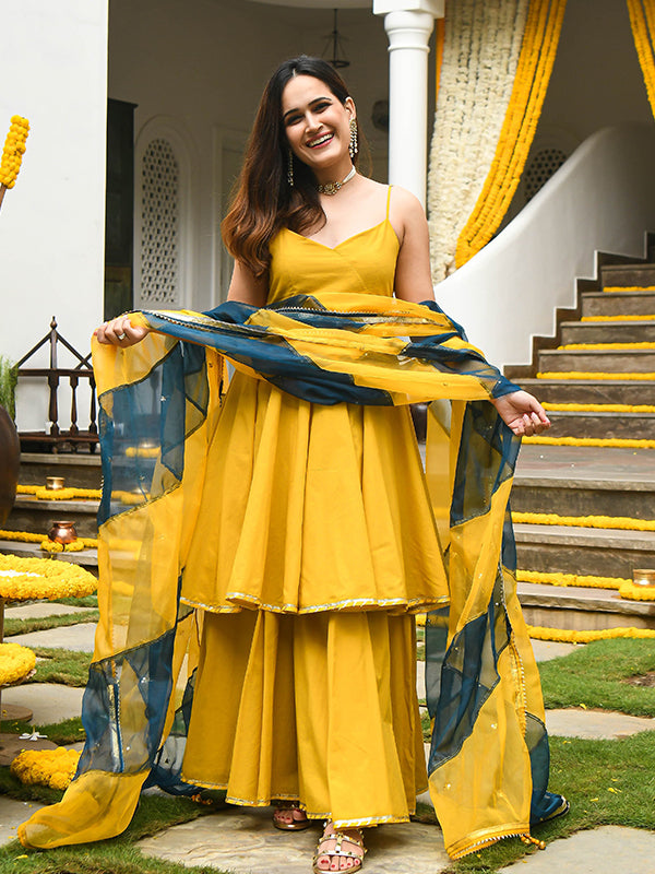 Buy Mustard Yellow Georgette Kurta With Sharara & Dupatta Set Online. This Kurti Is A Must Have In Every Woman's Wardrobe.
