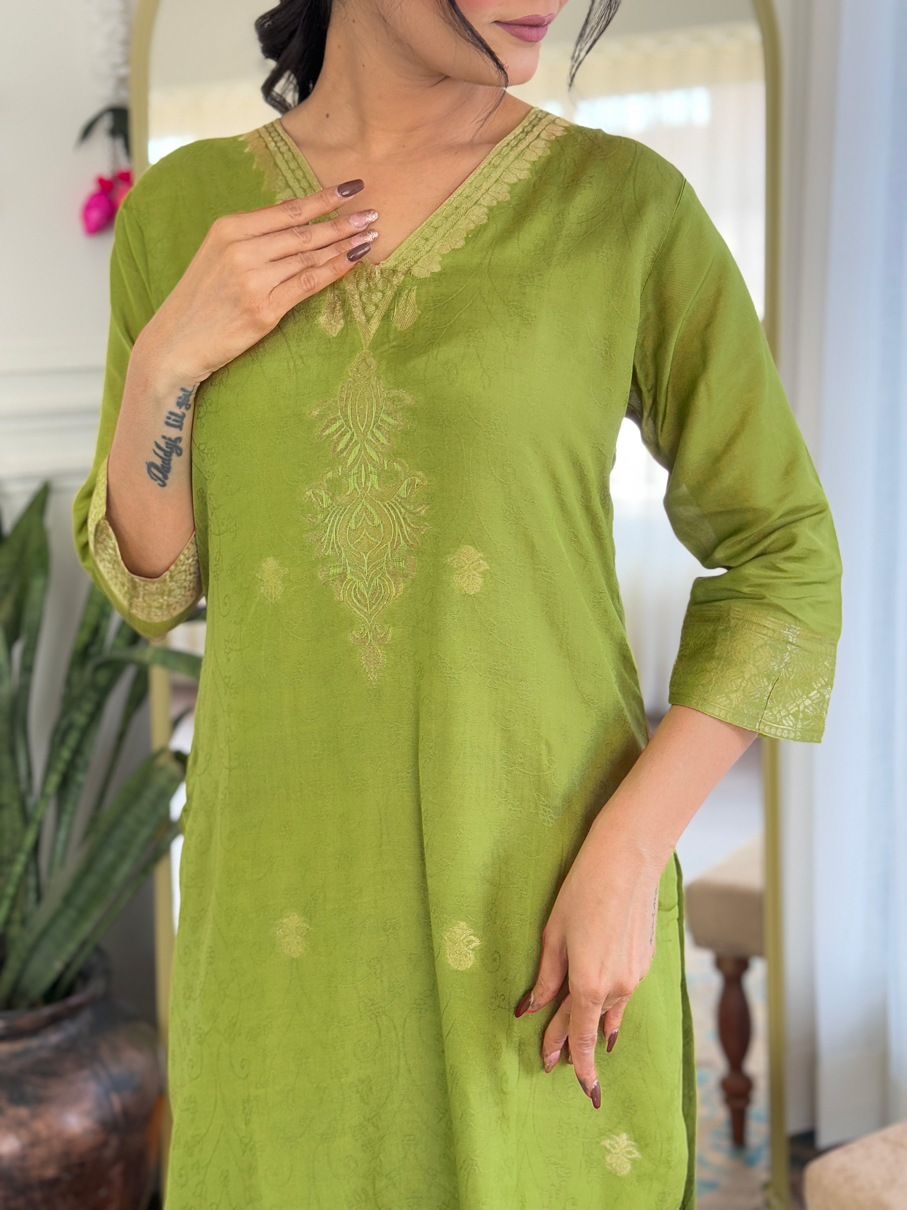 GREEN  COLOURED  WOMEN'S VISCOSE JACQUARD   KURTA  WITH PANT DUPATTA  SET