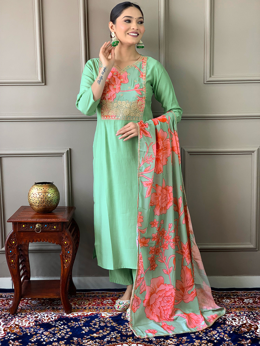 PISTA COLOURED  WOMEN'S  CHANDERI  WITH COTTON LINNING  EMBROIDERED STRAIGHT KURTA WITH PANT DUPATTA SET