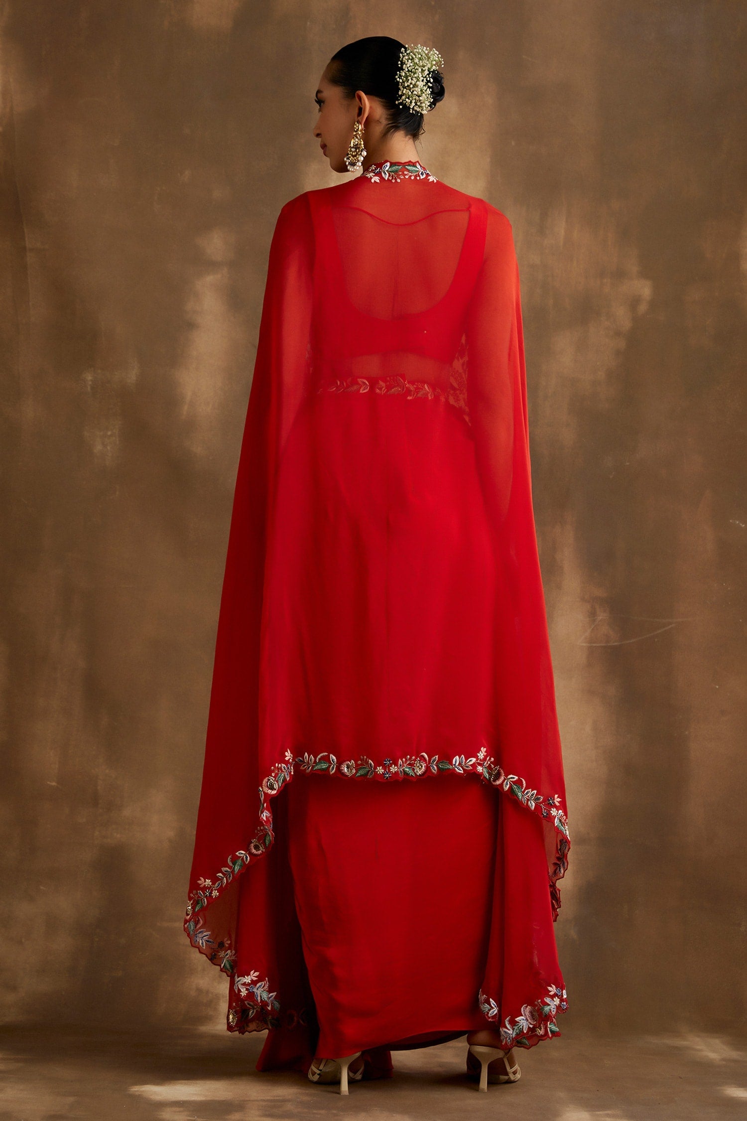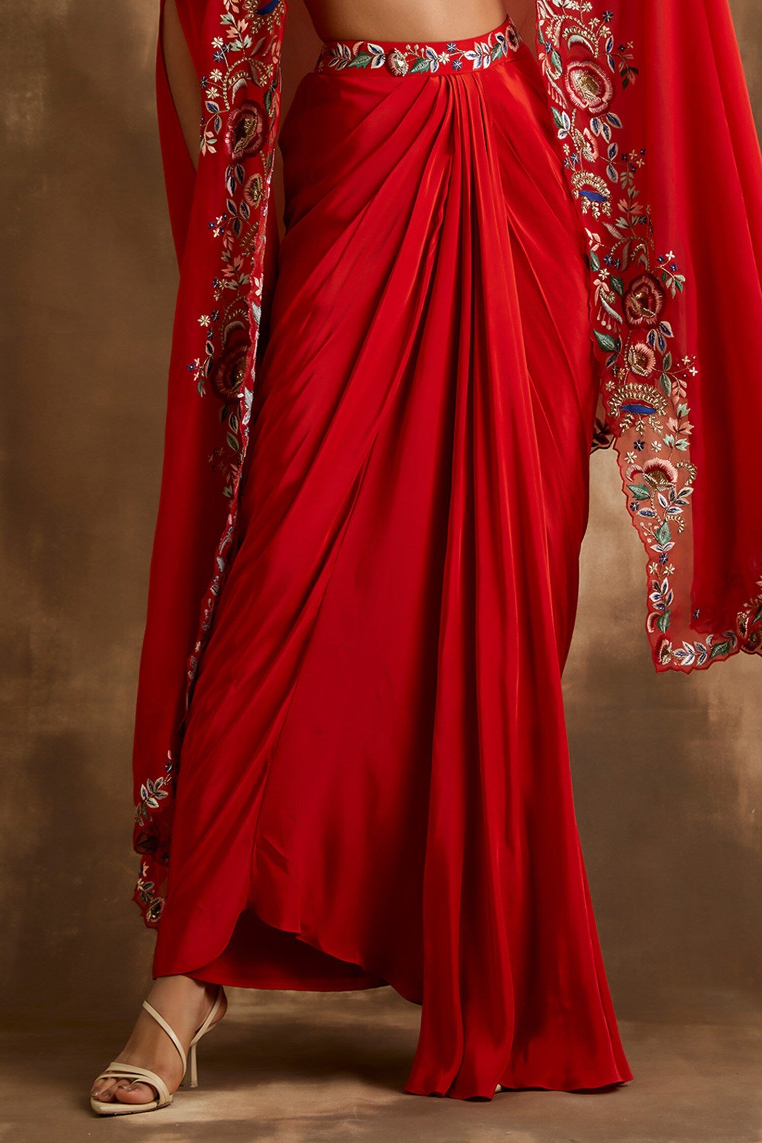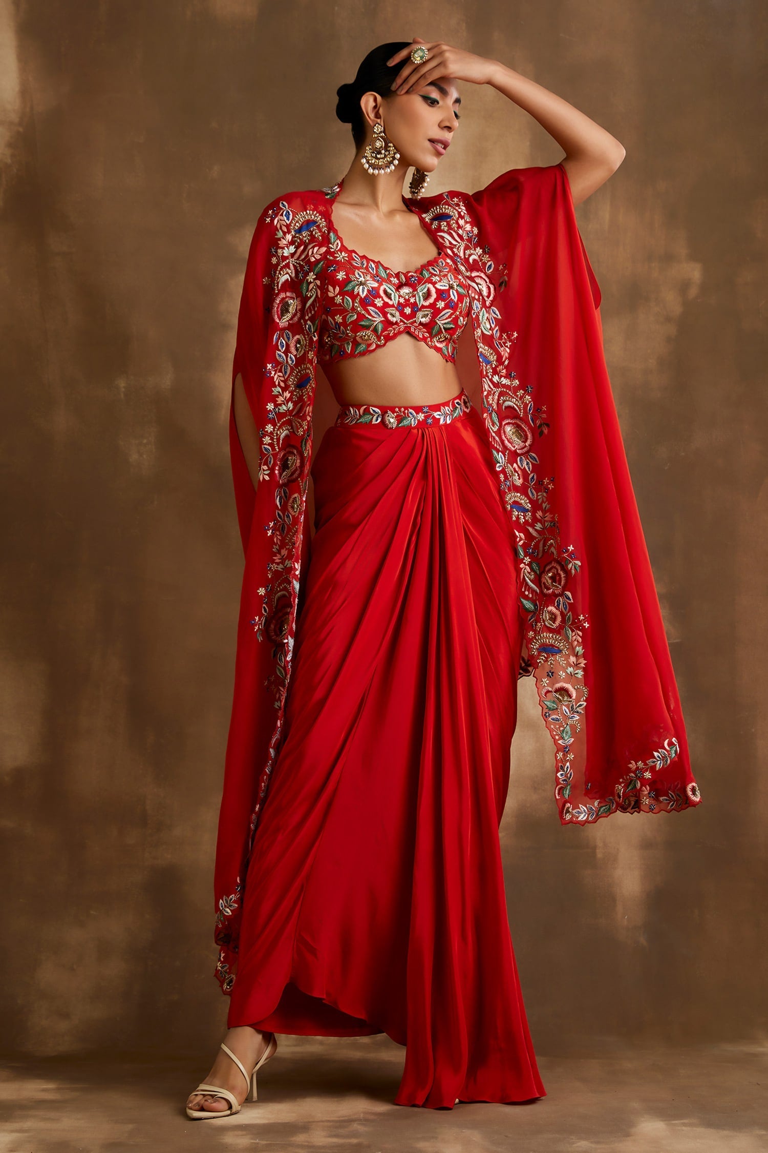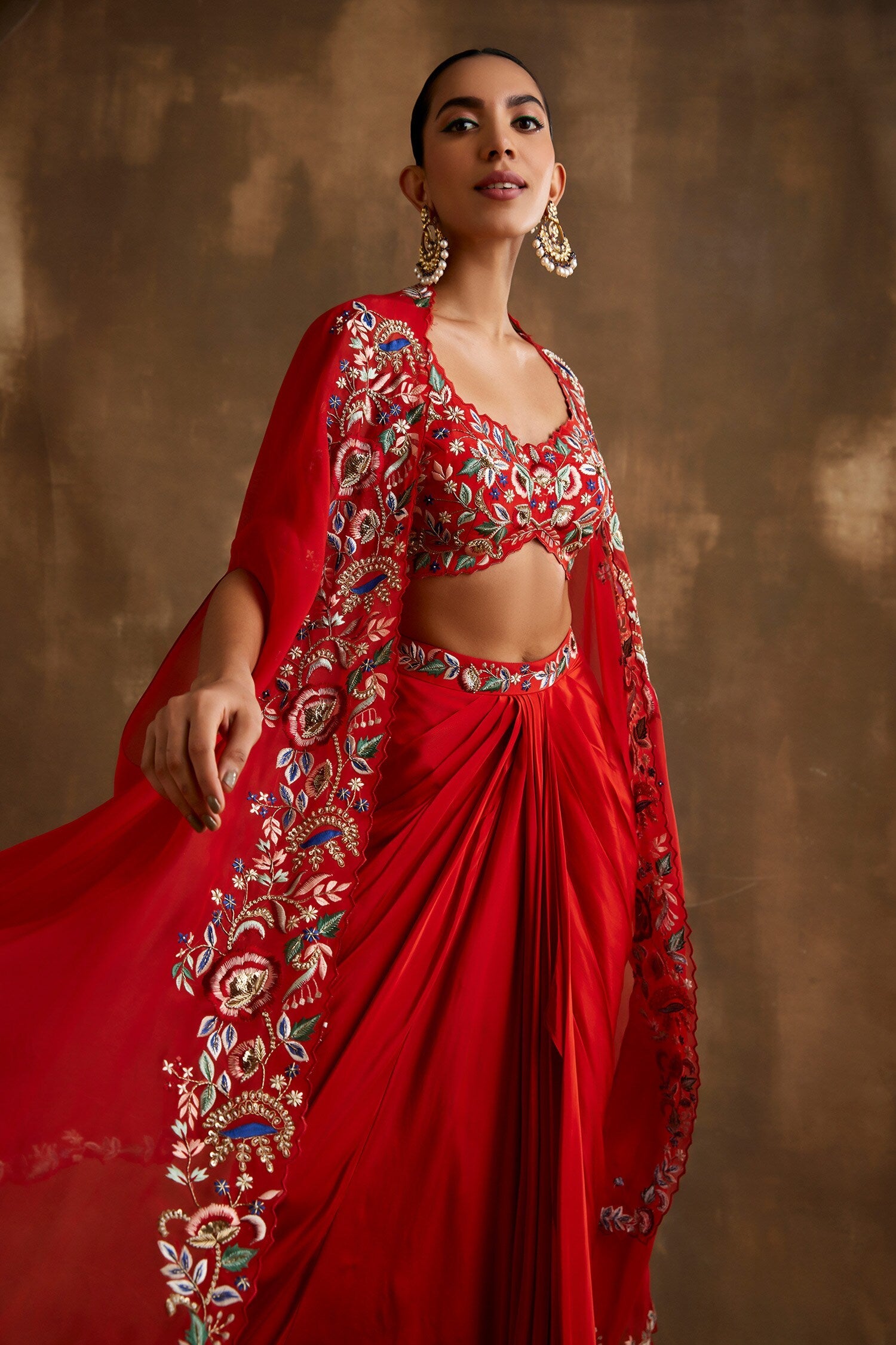 Red draped skirt with embroidered crop top & cape