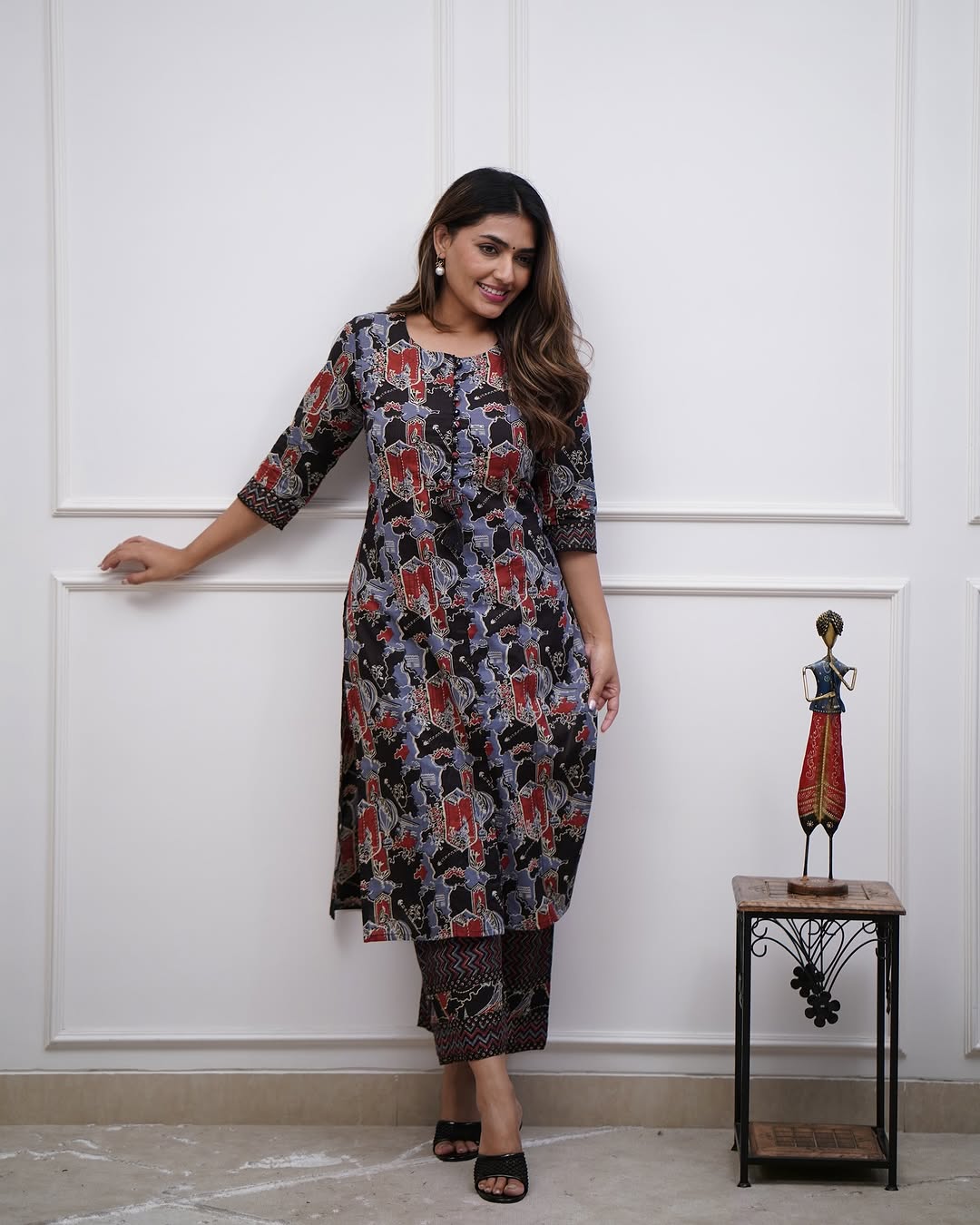 SARA Black Cotton Kurta with Bottom | Digital Printed Casual & Workwear Set | Comfortable Daily Wear Kurta – Malaysia