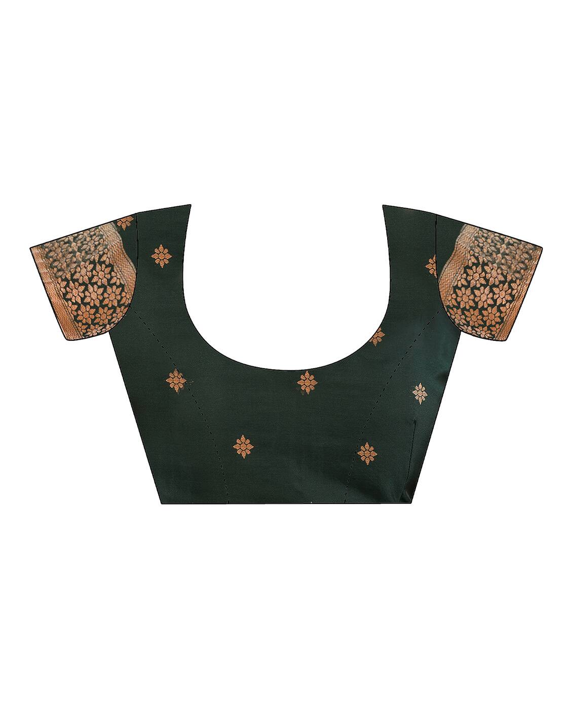 The last image shows the blouse piece included with this saree. The model is wearing a stitched blouse for reference.