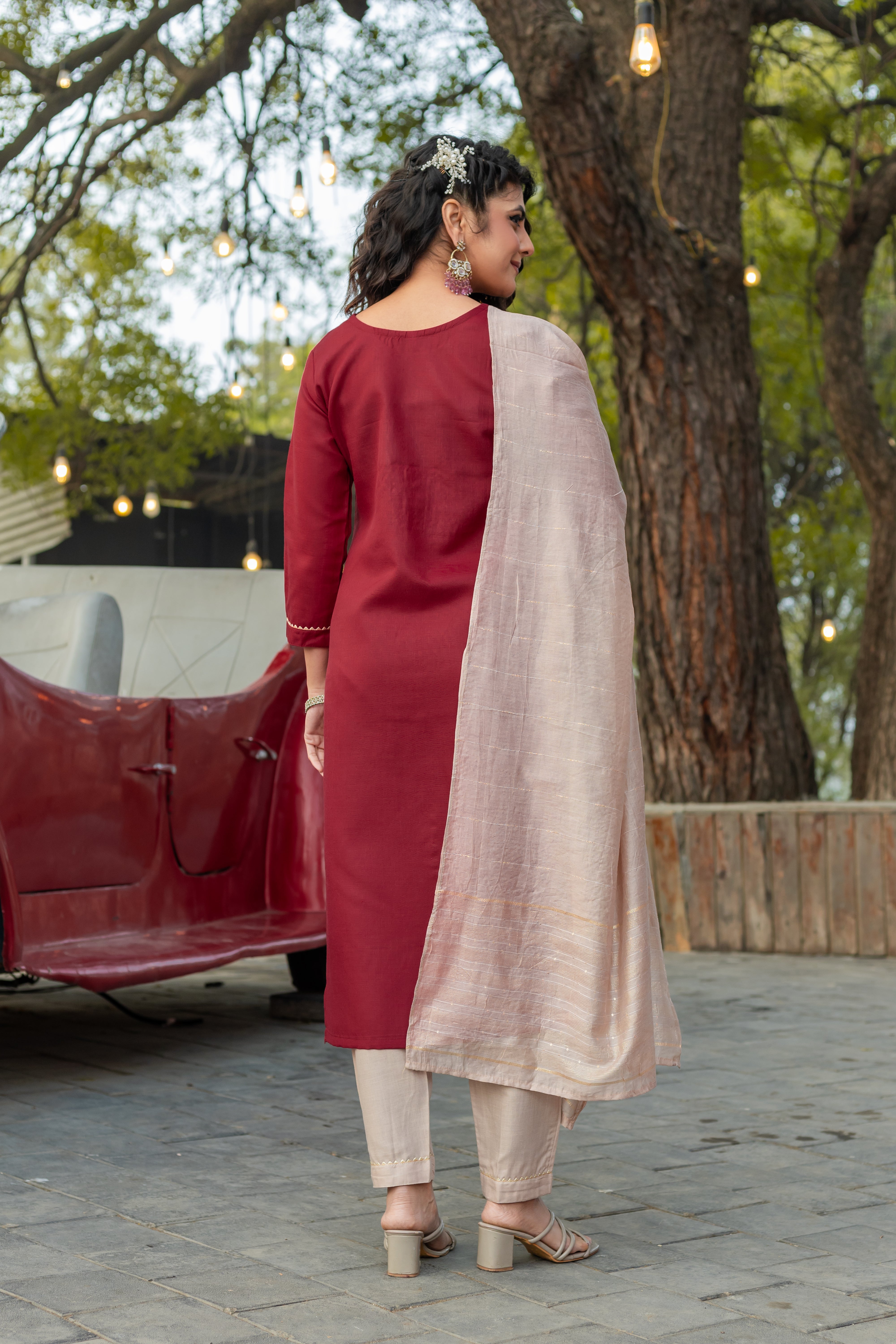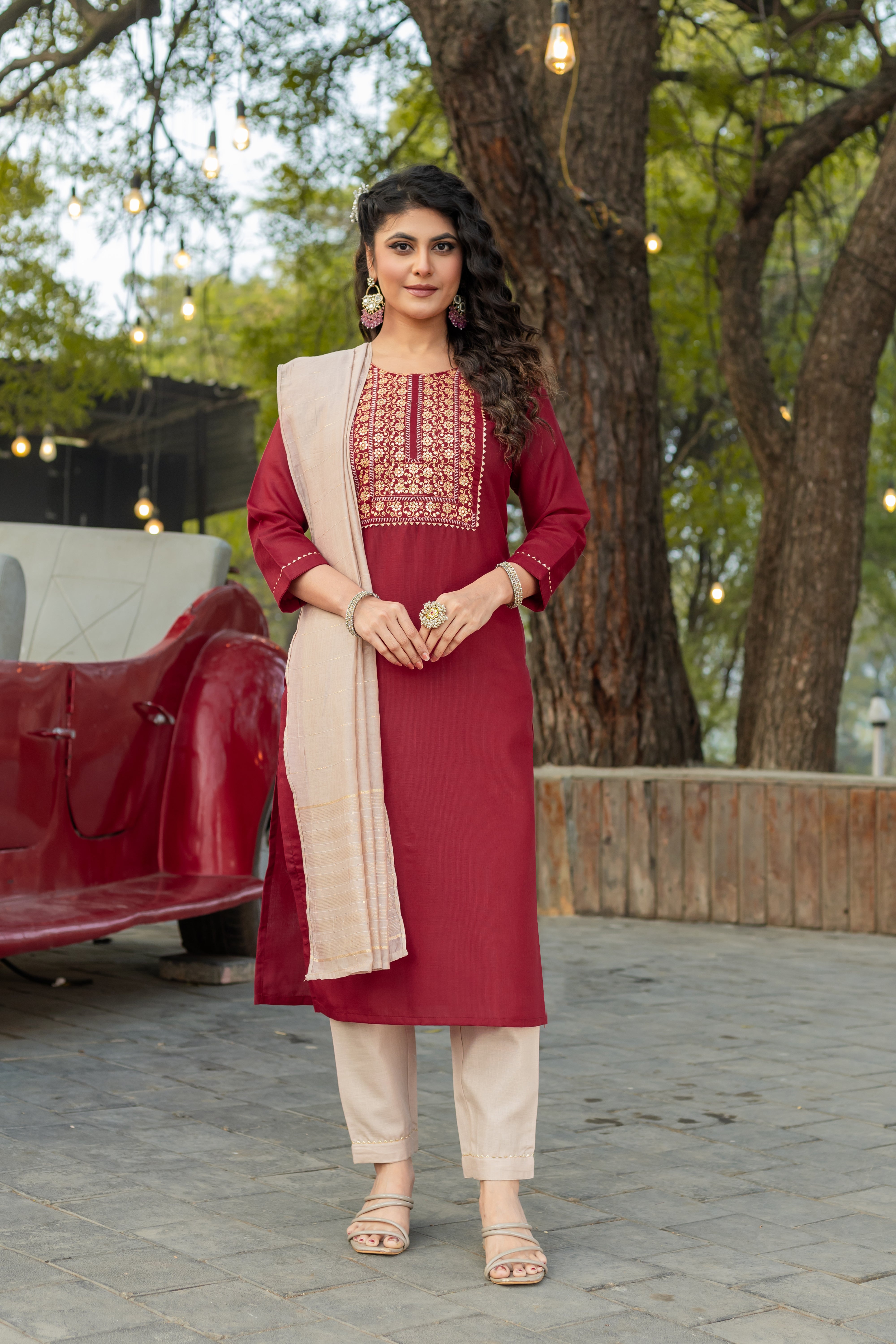 SK-19 Red Cotton Blend Kurta Set with Bottom & Chandery Dupatta | Embroidered 3-Piece Ethnic Wear – Malaysia
