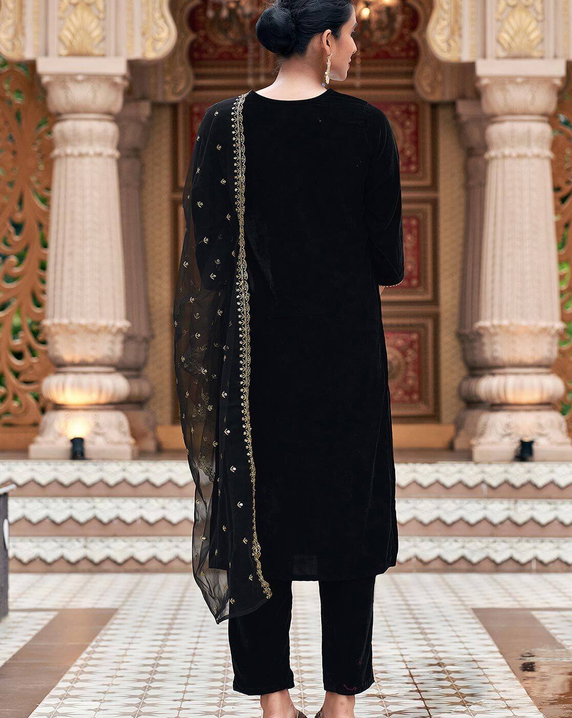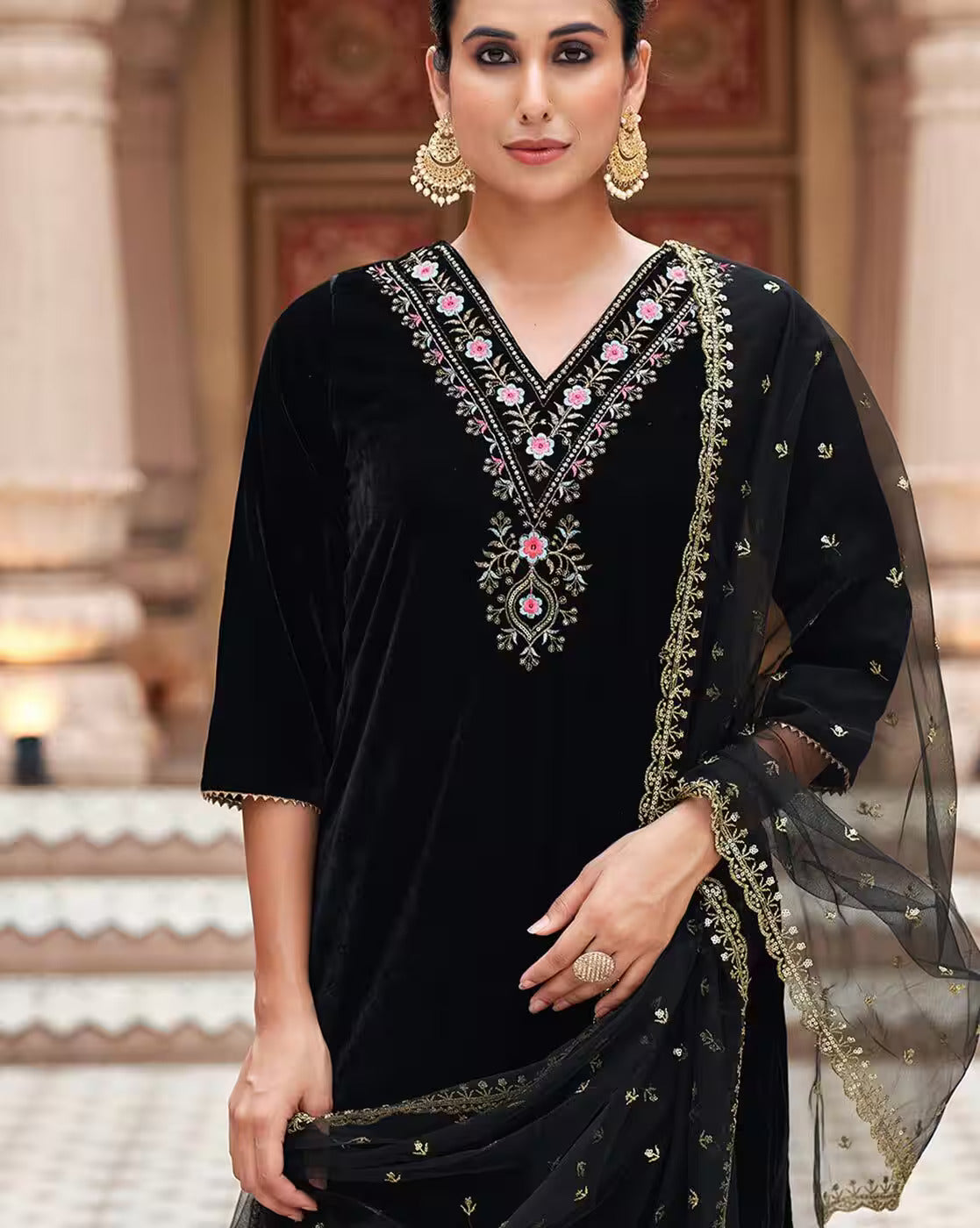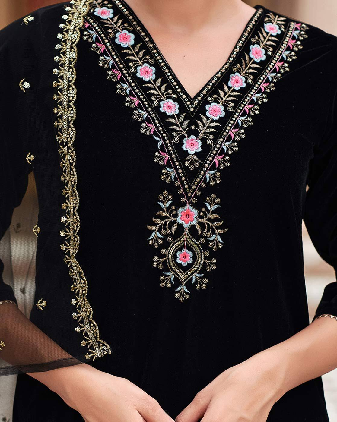 SKYLEE Women Velvet Sequins Embroidered Straight Kurta Set with Dupatta