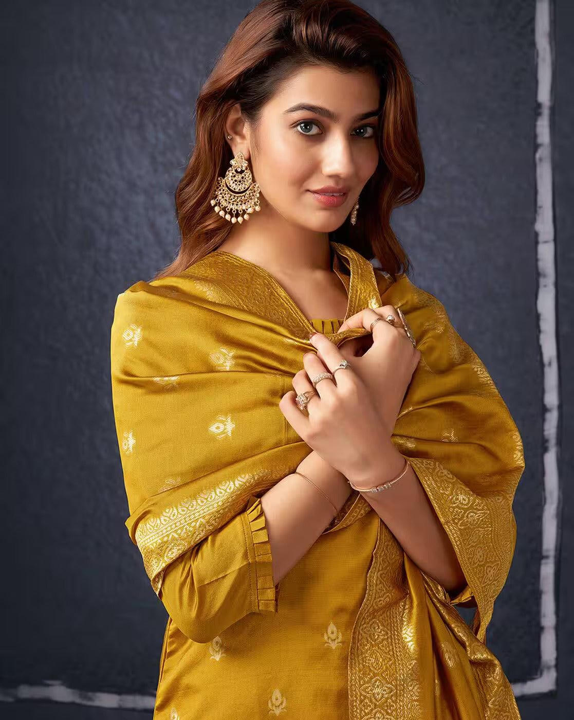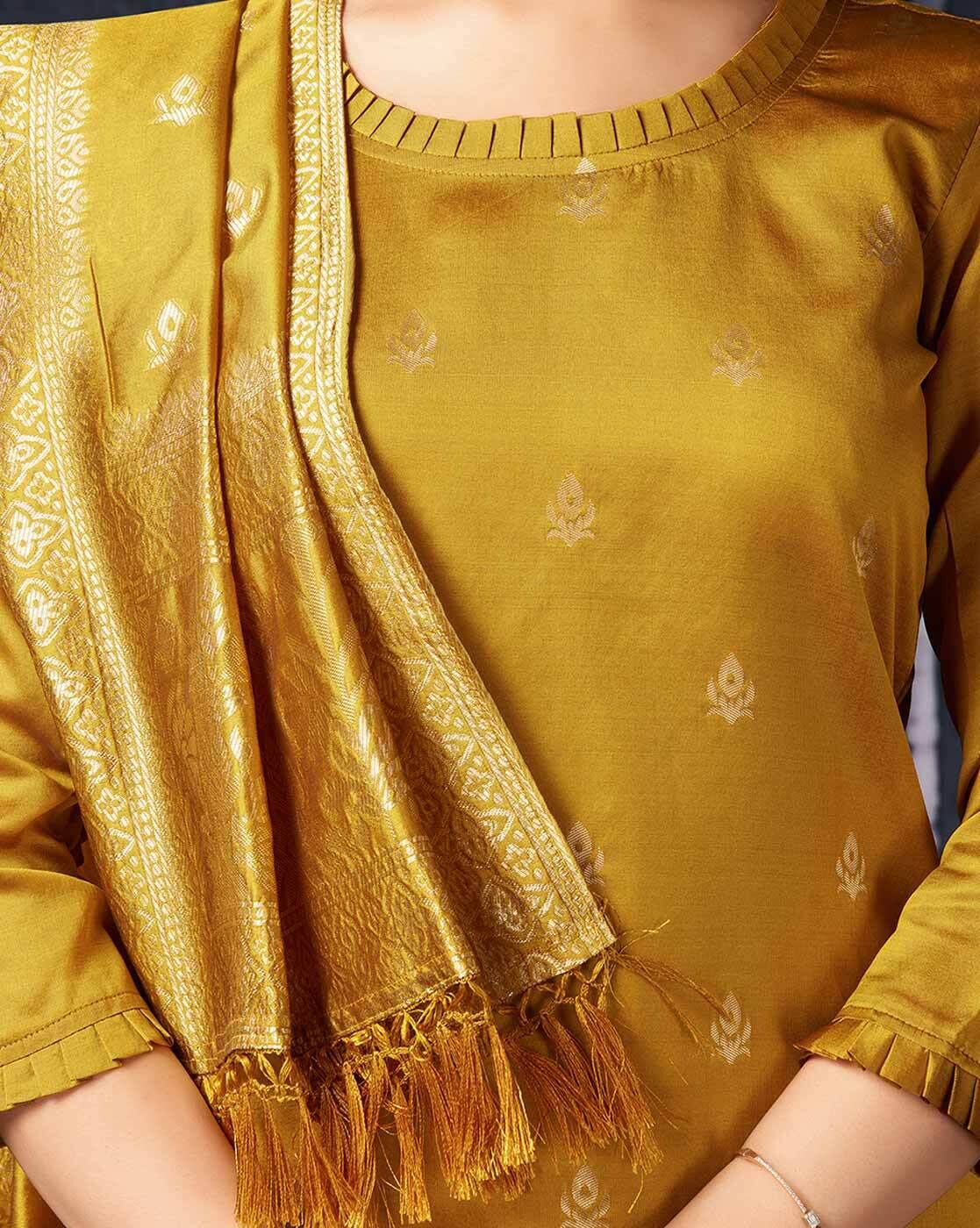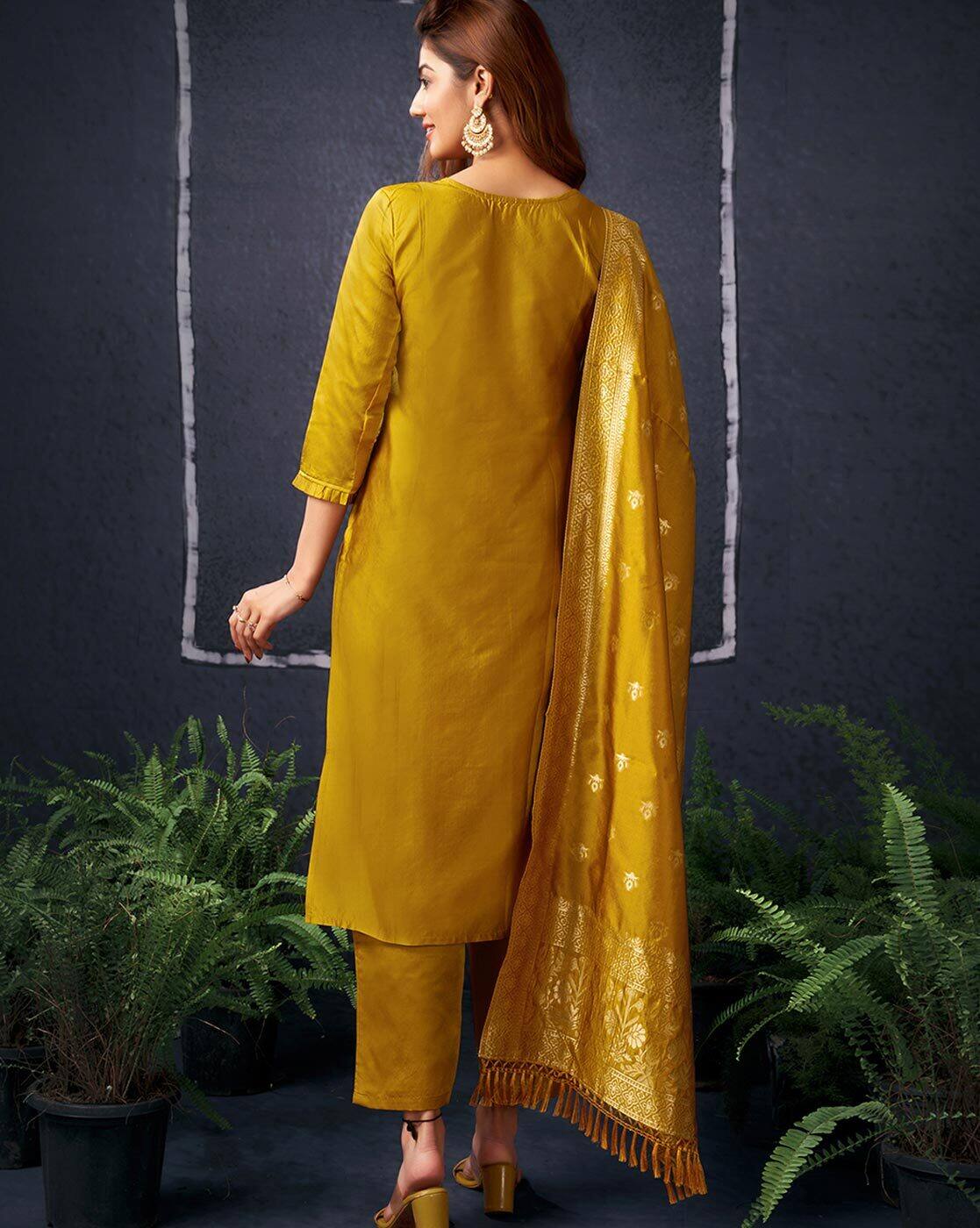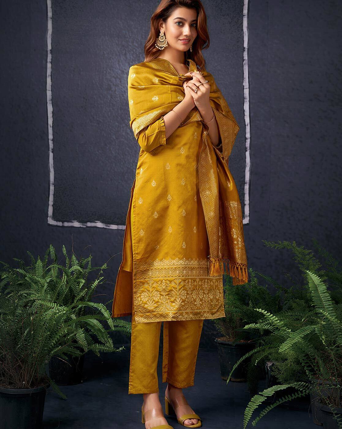 Style Highlight: Elegant woven silk blend fabric with straight kurta silhouette, paired with matching pants and dupatta for a graceful traditional look
