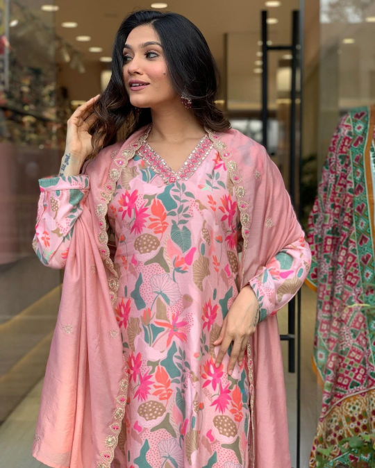 LIGHAT PINK  COLOURED  WOMEN'S COTTON  EMBROIDERED  KURTA WITH PANT DUPATTA SET