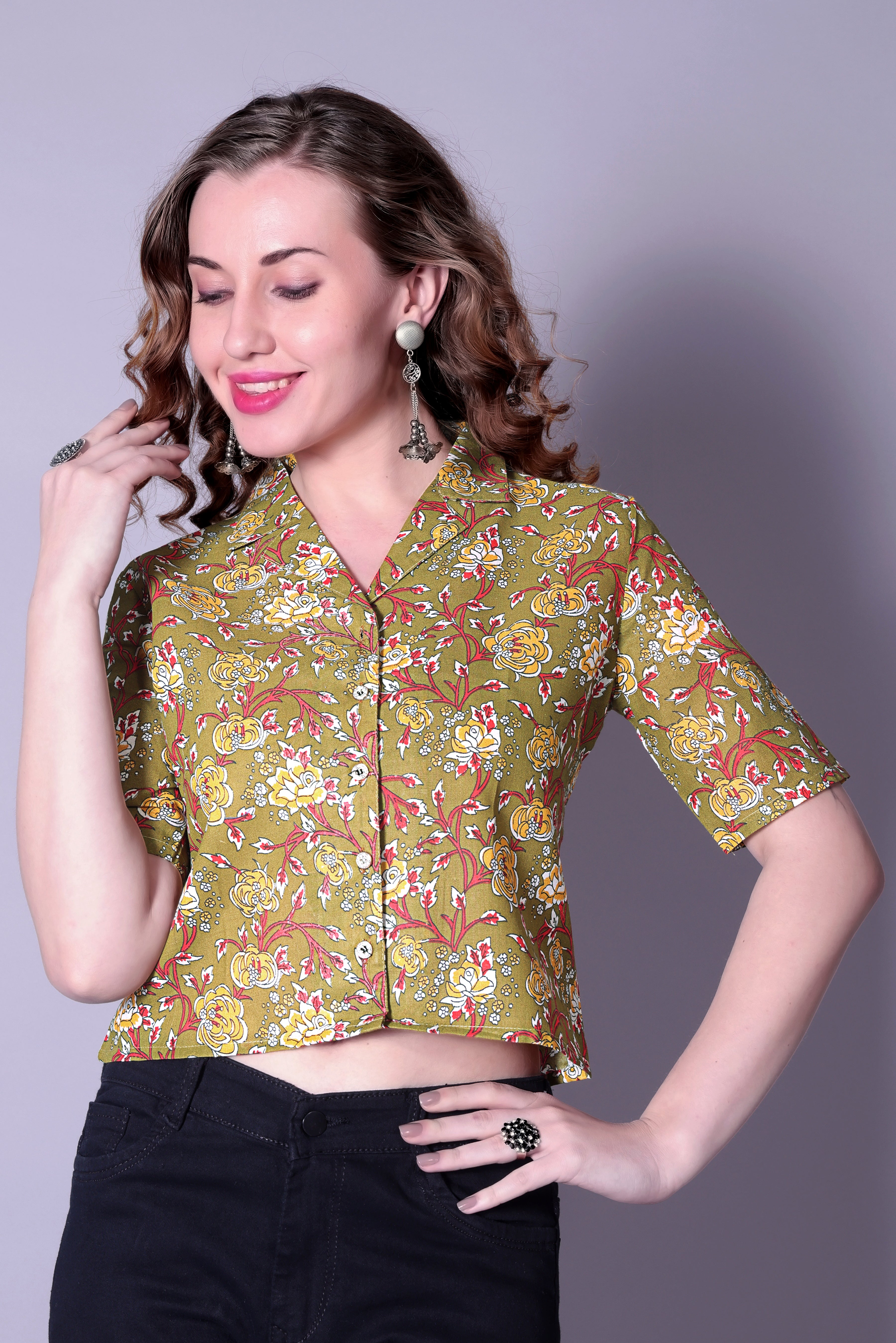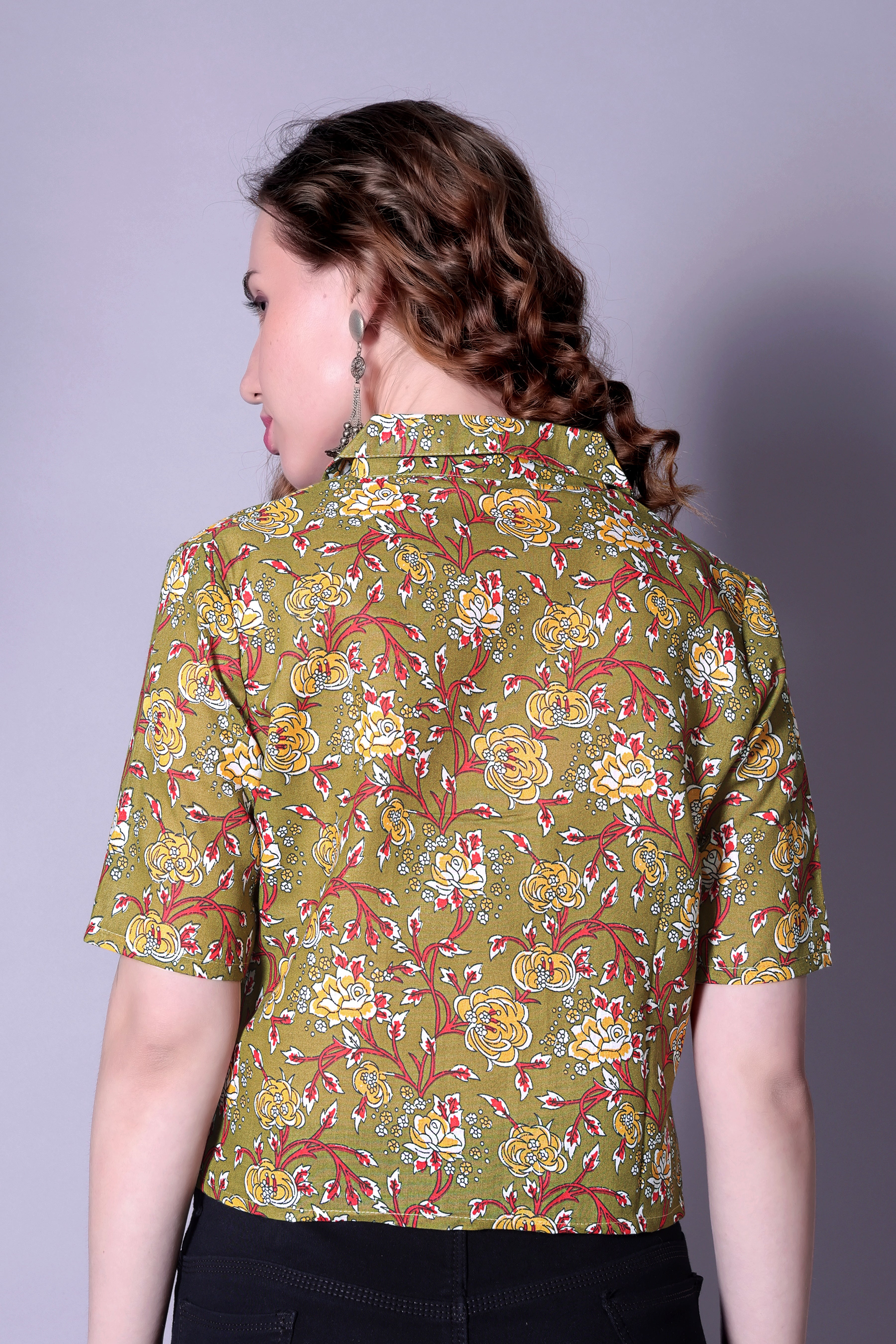 Product Name / Code: Women’s Olive Green Floral Printed Cotton Crop Shirt (C-15)