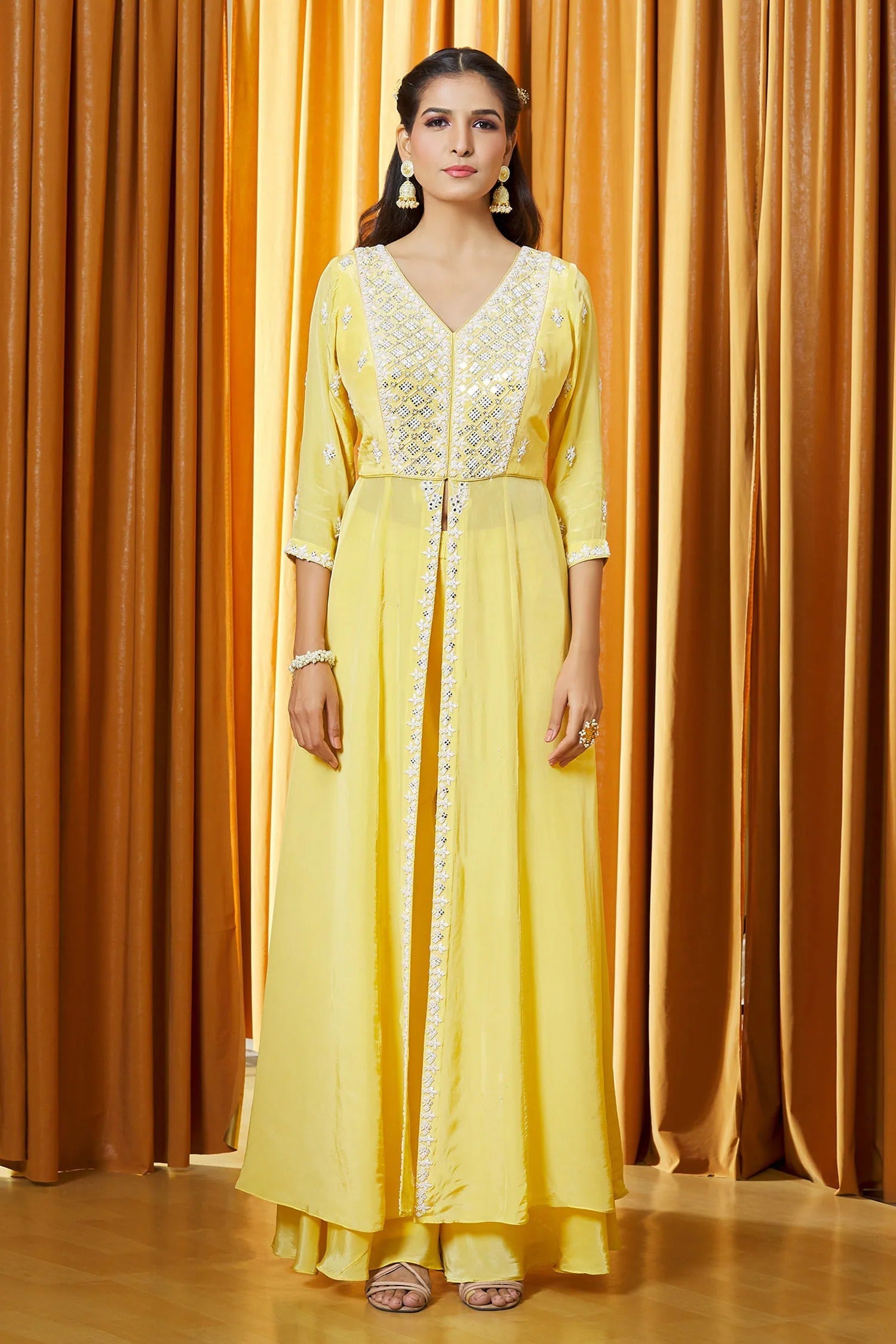 Yellow Kurta And Palazzo Natural Crepe Mirror Work Slit Set For Women. This Kurti Is A Must Have In Every Woman's Wardrobe. |
