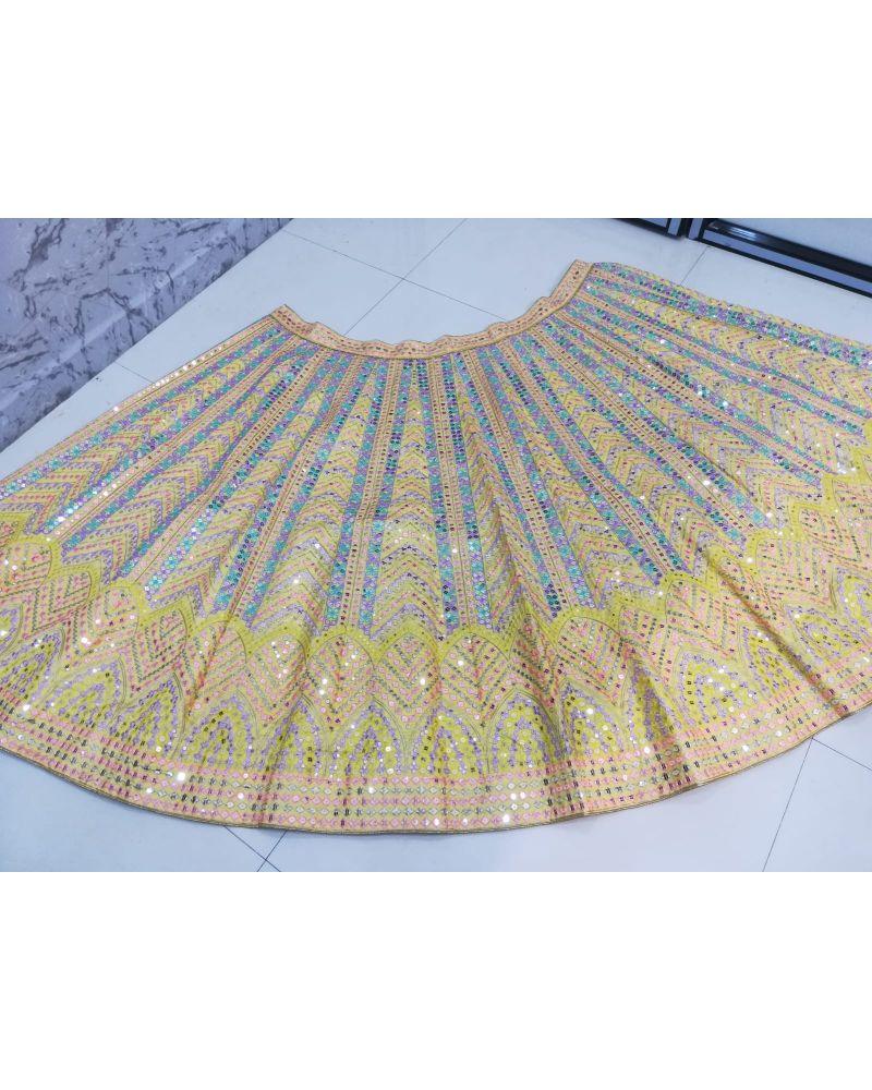 This Yellow dola silk multi thread & sequins embroidery designer wedding Lehenga choli for Bride is perfect for haldi events. Made with premium quality materials, it offers a comfortable fit and the sequins embroidery adds a touch of elegance. Make a statement and stand out on your special day with this stunning Lehenga choli.